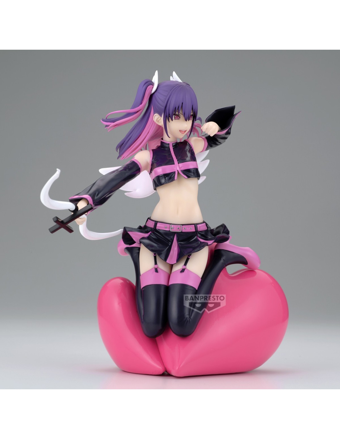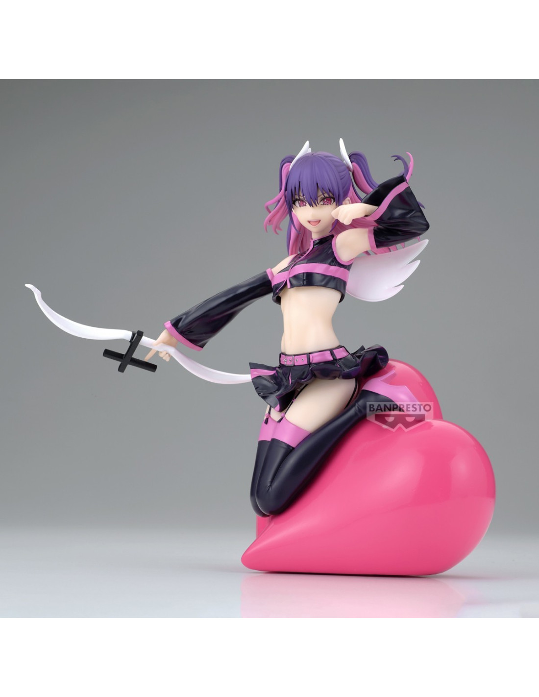 Miriella est représentée dans une pose captivante, assise sur un cœur géant, avec des détails raffinés qui mettent en valeur sa tenue contrastée et son épée délicate.
